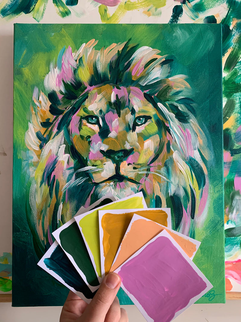 You will notice the different colour palettes used in my paintings. I can also demonstrate how colours will look together, via the colour swatches (pictured to the right) or using base colours from previous paintings. All I'll need are screenshots of any previous artworks of mine that you liked or photographs of your home decor for inspiration.